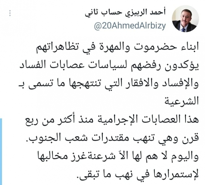 وكشف في تغريدة على حسابه بموقع التدوين المصغر تويتر، اليوم أن: "أبناء حضرموت والمهرة في تظاهراتهم يؤكدون رفضهم لسياسات عصابات الفساد والإفساد والإفقار التي تنتهجها ما تسمى بـ الشرعية".