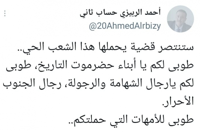 وأردف قائلا: "طوبى لكم يا أبناء حضرموت التاريخ، طوبى لكم يا رجال الشهامة والرجولة، رجال الجنوب الأحرار، طوبى للأمهات التي حملتكم".