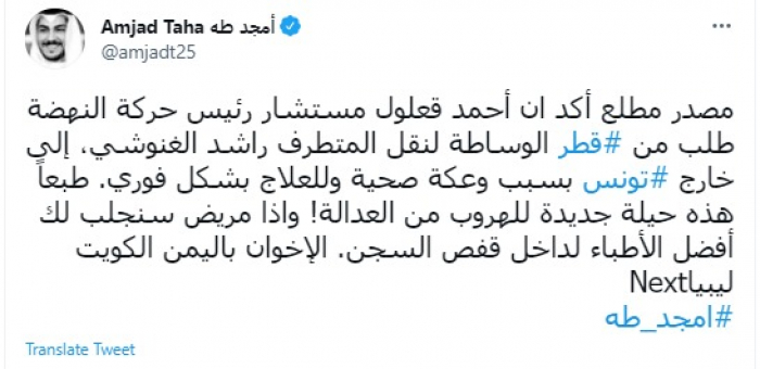 وقال في تغريدة عبر "تويتر" رصدها "المشهد العربي": "مصدر مطلع أكد أن أحمد قعلول مستشار رئيس حركة النهضة طلب من قطر الوساطة لنقل المتطرف راشد الغنوشي، إلى خارج تونس بسبب وعكة صحية وللعلاج بشكل فوري".