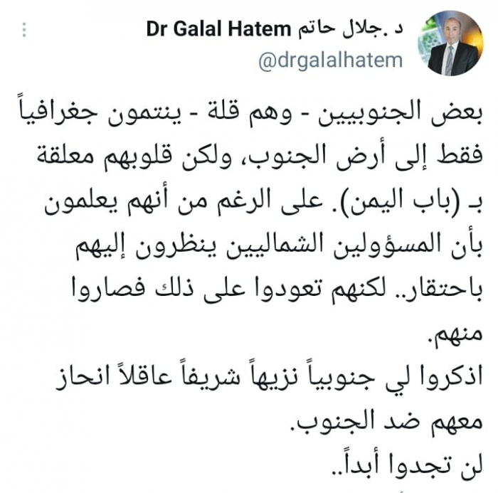 وأشار في تغريدة على حسابه بموقع التدوين المصغر تويتر، اليوم إلى أن هناك: "بعض الجنوبيين - وهم قلة - ينتمون جغرافياً فقط إلى أرض الجنوب، ولكن قلوبهم معلقة بـ (باب اليمن)".