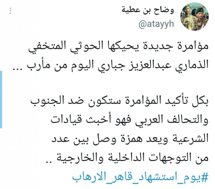 وأضاف أنه: "بكل تأكيد المؤامرة ستكون ضد الجنوب والتحالف العربي فهو أخبث قيادات الشرعية ويعد همزة وصل بين عدد من التوجهات الداخلية والخارجية"، مختتما بهاشتاج: يوم استشهاد قاهر الإرهاب".