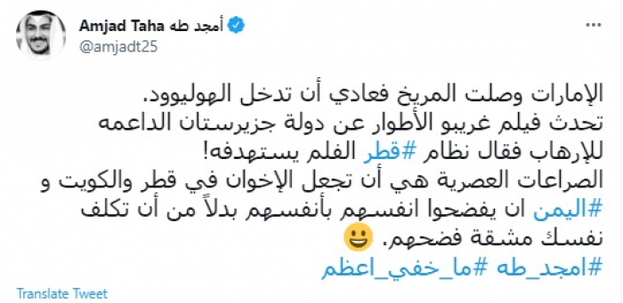 وكتب في تغريدة عبر "تويتر" رصدها "المشهد العربي": "الإمارات وصلت المريخ، فعادي أن تدخل الهوليوود. تحدث فيلم غريبو الأطوار عن دولة جزيرستان الداعمة للإرهاب فقال نظام قطر الفلم يستهدفه!".