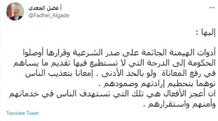 وقال في تغريدة عبر "تويتر" رصدها "المشهد العربي": "أدوات الهيمنة الجاثمة على صدر الشرعية وقرارها أوصلوا الحكومة إلى الدرجة التي لا تستطيع فيها تقديم ما يساهم في رفع المعاناة ولو بالحد الأدنى، إمعانًا بتعذيب الناس توهما بتحطيم إرادتهم وصمودهم".