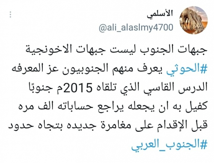 وأكد أن: "الحوثي يعرف منهم الجنوبيون عز المعرفة، الدرس القاسي الذي تلقاه 2015م جنوبًا كفيل به أن يجعله يراجع حساباته ألف مرة قبل الإقدام على مغامرة جديدة تجاه حدود الجنوب العربي".