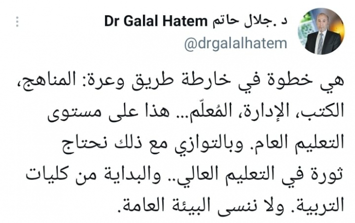 وأكد في تغريدة على حسابه بموقع التدوين المصغر تويتر، اليوم أنها: "خطوة في خارطة طريق وعرة: المناهج، الكتب، الإدارة، المُعلّم، هذا على مستوى التعليم العام".