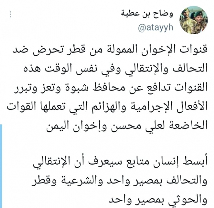 وأشار في تغريدة على حسابه بموقع التدوين المصغر تويتر، اليوم إلى أن: "قنوات الإخوان الممولة من قطر تحرض ضد التحالف والانتقالي".
