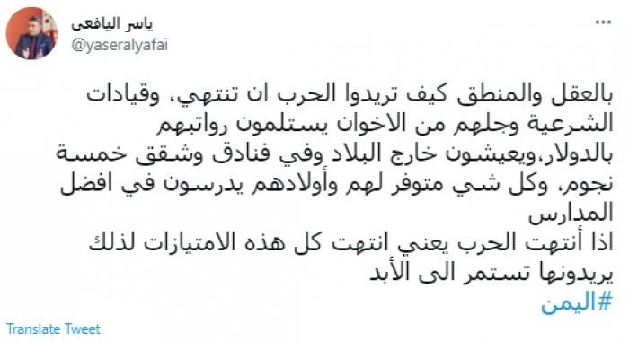 وكتب في تغريدة عبر "تويتر" رصدها "المشهد العربي": "بالعقل والمنطق كيف تريدون الحرب أن تنتهي، وقيادات الشرعية وجلهم من الإخوان يستلمون رواتبهم بالدولار، ويعيشون خارج البلاد وفي فنادق وشقق خمسة نجوم، وكل شيء متوفر لهم وأولادهم يدرسون في أفضل المدارس".