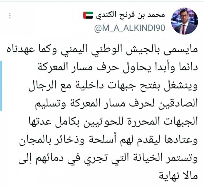 وأوضح في تغريدة على حسابه بموقع التدوين المصغر تويتر، اليوم أن: "ما يسمى بالجيش الوطني اليمني وكما عهدناه دائما وأبدا يحاول حرف مسار المعركة".