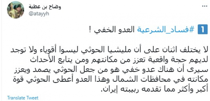 وكتب في تغريدة عبر "تويتر" رصدها "المشهد العربي": "فساد الشرعية العدو الخفي.. لا يختلف اثنان على أن مليشيا الحوثي ليسوا أقوياء ولا توجد لديهم حجة واقعية تعزز من مكانتهم".