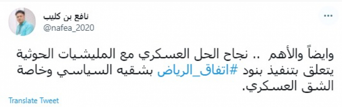 وكتب في تغريدة عبر "تويتر" رصدها "المشهد العربي": "وأيضًا والأهم.. نجاح الحل العسكري مع المليشيات الحوثية يتعلق بتنفيذ بنود اتفاق الرياض بشقيه السياسي وخاصة الشق العسكري".