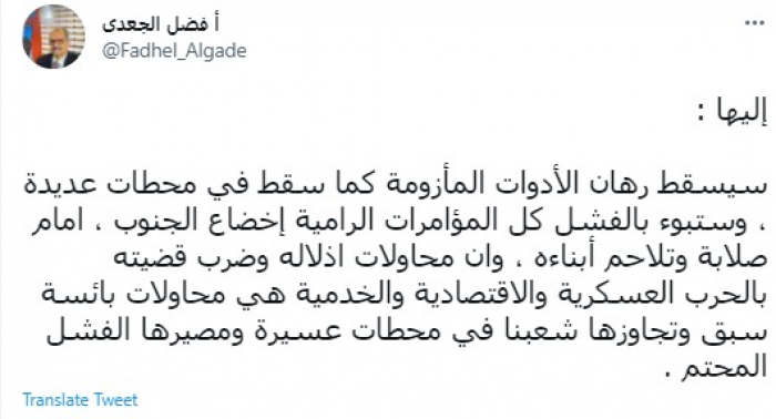 وكتب في تغريدة عبر "تويتر" رصدها "المشهد العربي": "سيسقط رهان الأدوات المأزومة كما سقط في محطات عديدة، وستبوء بالفشل كل المؤامرات الرامية إخضاع الجنوب، أمام صلابة وتلاحم أبناءه".