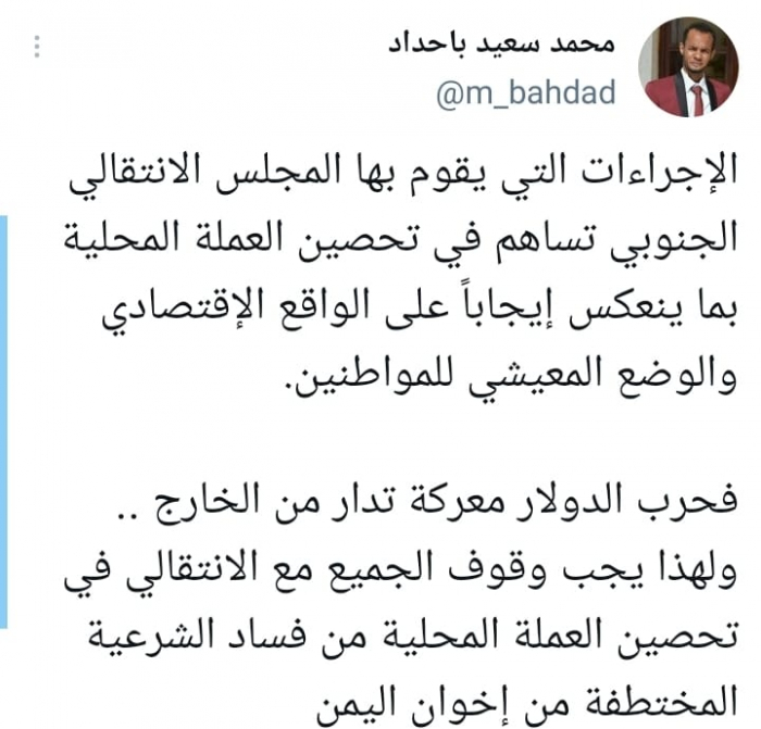 وشدد في تغريدة على حسابه بموقع التدوين المصغر تويتر، اليوم على أن: "الإجراءات التي يقوم بها المجلس الانتقالي الجنوبي تساهم في تحصين العملة المحلية".