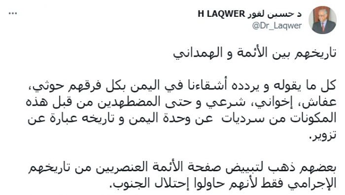 وأشار في تغريدة على حسابه بموقع التدوين المصغر تويتر، اليوم إلى أن: "تاريخهم بين الأئمة و الهمداني".