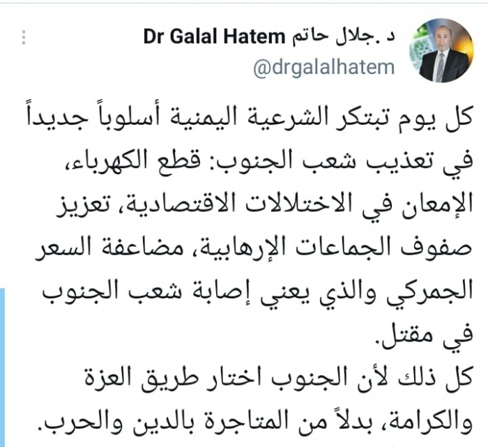 حاتم: الشرعية تنتقم من الجنوب لاختياره طريق الكرامة