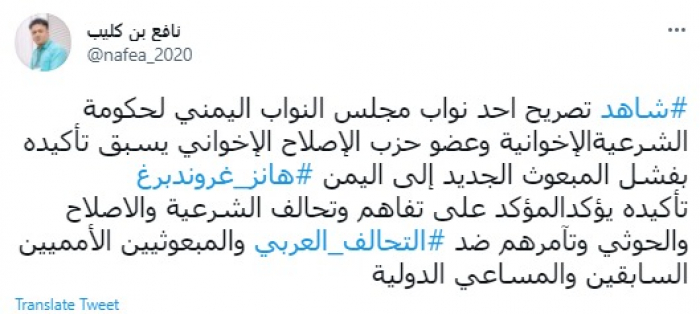 وكتب في تغريدة عبر "تويتر" رصدها "المشهد العربي": "شاهد تصريح أحد نواب مجلس النواب اليمني لحكومة الشرعية الإخوانية وعضو حزب الإصلاح الإخواني يسبق تأكيده بفشل المبعوث الجديد إلى اليمن هانس جروندبيرج".