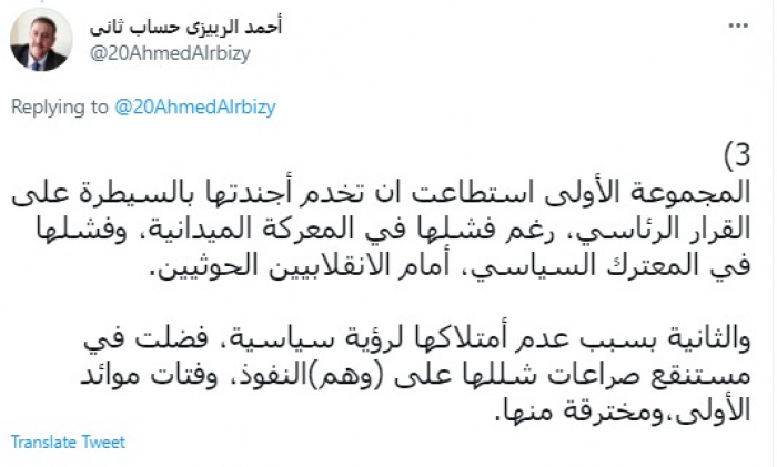 وتابع: "المجموعة الأولى استطاعت أن تخدم أجندتها بالسيطرة على القرار الرئاسي، رغم فشلها في المعركة الميدانية، وفشلها في المعترك السياسي، أمام الانقلابيين الحوثيين. والثانية بسبب عدم امتلاكها لرؤية سياسية، فضلت في مستنقع صراعات شللها على (وهم)النفوذ، وفتات موائد الأولى، ومخترقة منها".