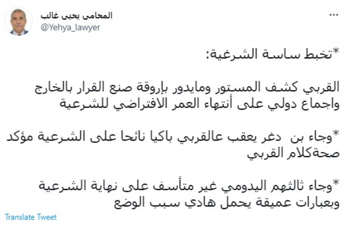 وقال في تغريدة عبر "تويتر" رصدها "المشهد العربي": "تخبط ساسة الشرعية: القربي كشف المستور وما يدور بأروقة صنع القرار بالخارج وإجماع دولي على انتهاء العمر الافتراضي للشرعية".