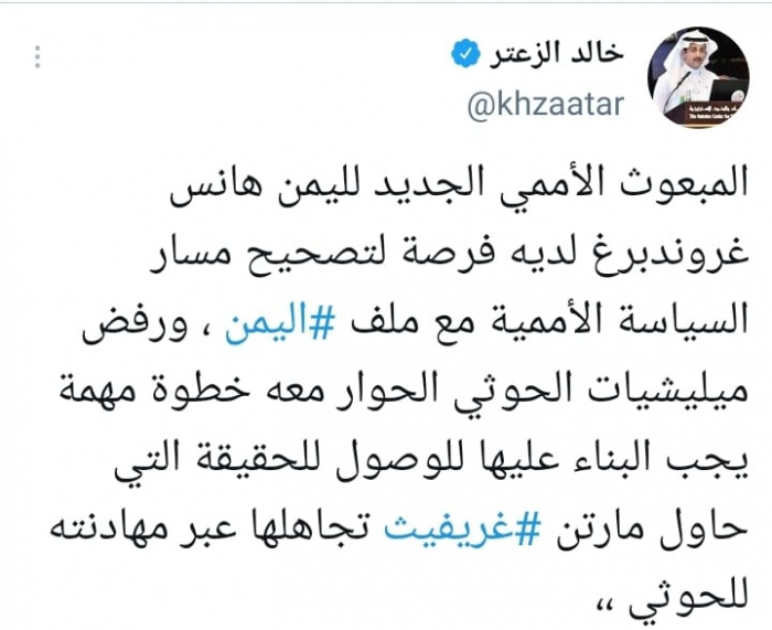 وأوضح في تغريدة على حسابه بموقع التدوين المصغر تويتر اليوم أن: "المبعوث الأممي الجديد لليمن هانس غروندبرغ لديه فرصة لتصحيح مسار السياسة الأممية مع ملف اليمن".