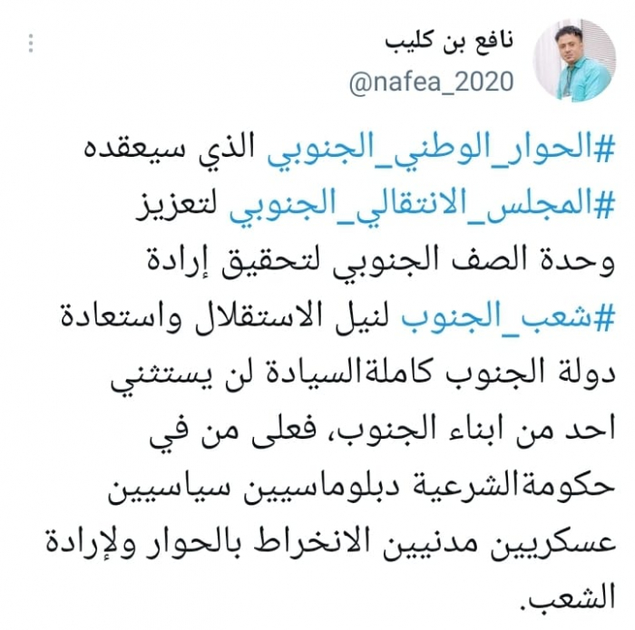 وشدد في تغريدة على حسابه بموقع التدوين المصغر تويتر، اليوم على أن: "الحوار الوطني الجنوبي الذي سيعقده المجلس الانتقالي الجنوبي لتعزيز وحدة الصف الجنوبي لتحقيق إرادة شعب الجنوب لنيل الاستقلال واستعادة دولة الجنوب كاملة السيادة لن يستثني أحد من أبناء الجنوب".