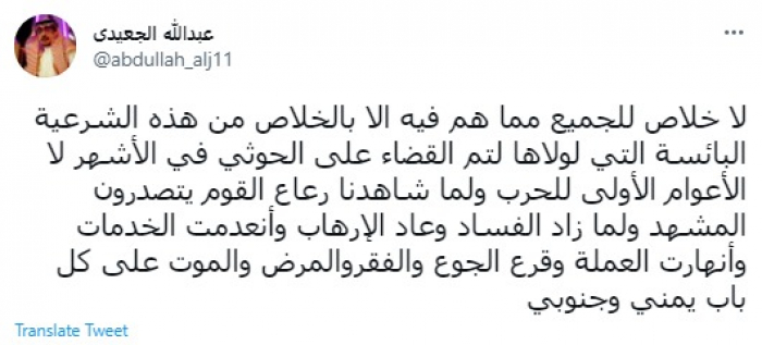 وقال في تغريدة عبر "تويتر" رصدها "المشهد العربي": "لا خلاص للجميع مما هم فيه إلا بالخلاص من هذه الشرعية البائسة التي لولاها لتم القضاء على الحوثي في الأشهر لا الأعوام الأولى للحرب".