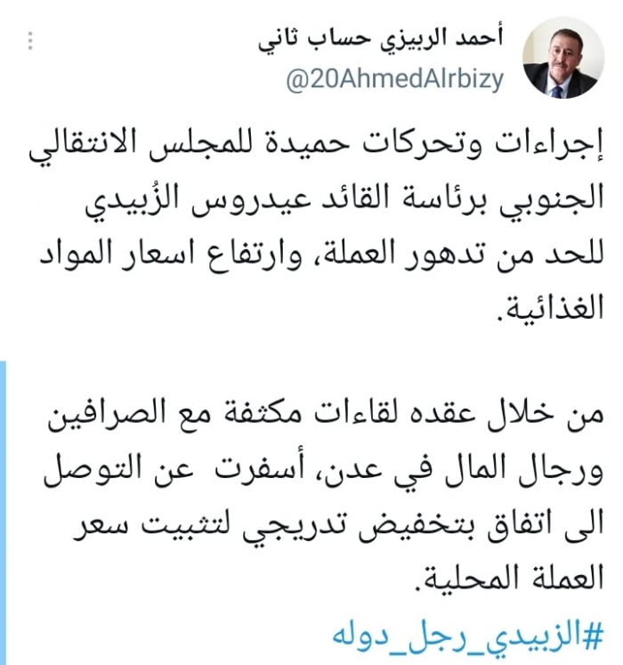 ووصفها في تغريدة على حسابه بموقع التدوين المصغر تويتر اليوم بأنها: "إجراءات وتحركات حميدة للمجلس الانتقالي الجنوبي برئاسة القائد عيدروس الزُبيدي للحد من تدهور العملة، وارتفاع اسعار المواد الغذائية".