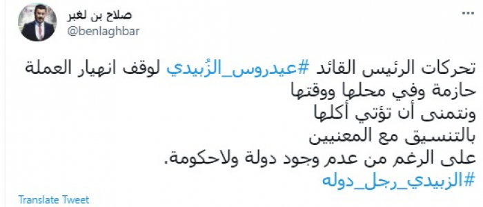 وقال في تغريدة عبر "تويتر" رصدها "المشهد العربي": "تحركات الرئيس القائد عيدروس الزُبيدي لوقف انهيار العملة حازمة وفي محلها ووقتها ونتمنى أن تؤتي أكلها بالتنسيق مع المعنيين على الرغم من عدم وجود دولة ولا حكومة".
