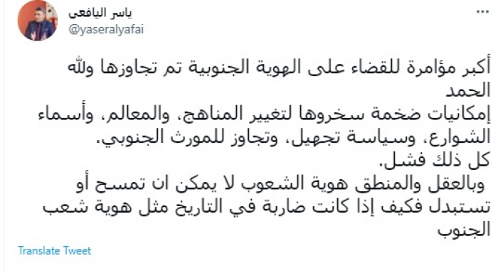 وكتب في تغريدة عبر "تويتر" رصدها "المشهد العربي": "أكبر مؤامرة للقضاء على الهوية الجنوبية تم تجاوزها ولله الحمد إمكانيات ضخمة سخروها لتغيير المناهج، والمعالم، وأسماء الشوارع، وسياسة تجهيل، وتجاوز للمورث الجنوبي. كل ذلك فشل".
