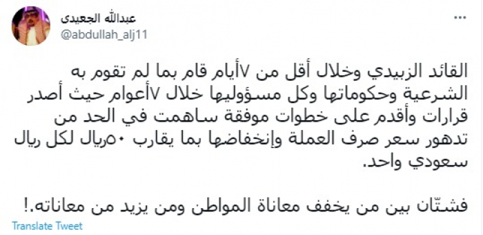 وقال في تغريدة عبر "تويتر" رصدها "المشهد العربي": "القائد الزُبيدي وخلال أقل من 7 أيام قام بما لم تقوم به الشرعية وحكوماتها وكل مسؤوليها خلال 7 أعوام حيث أصدر قرارات وأقدم على خطوات موفقة ساهمت في الحد من تدهور سعر صرف العملة وانخفاضها بما يقارب 50 ريال لكل ريال سعودي واحد".