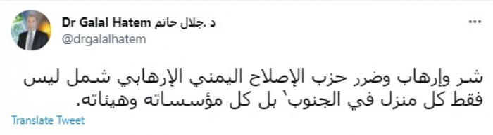 وقال في تغريدة عبر "تويتر" رصدها "المشهد العربي": "شر وإرهاب وضرر حزب الإصلاح اليمني الإرهابي شمل ليس فقط كل منزل في الجنوب بل كل مؤسساته وهيئاته".