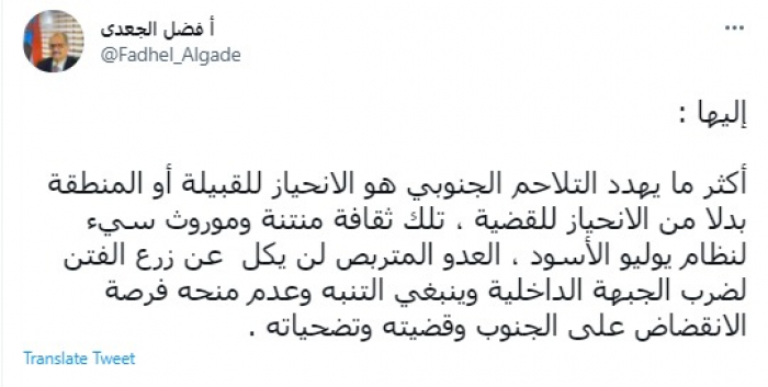 وكتب في تغريدة عبر "تويتر" رصدها "المشهد العربي": "أكثر ما يهدد التلاحم الجنوبي هو الانحياز للقبيلة أو المنطقة بدلا من الانحياز للقضية، تلك ثقافة .... وموروث سيء لنظام يوليو الأسود".