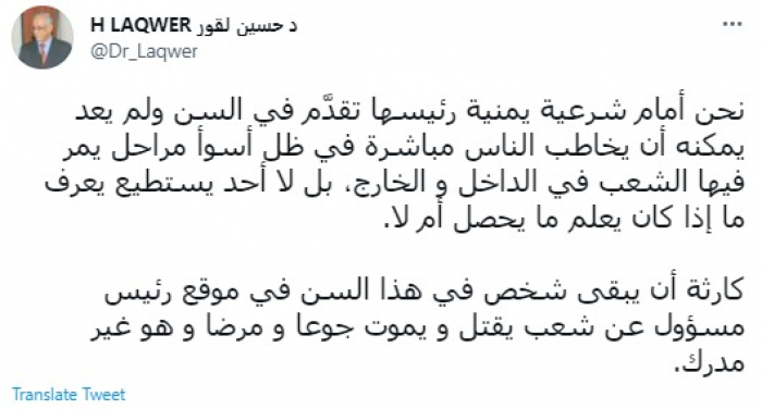 وقال في تغريدة عبر "تويتر" رصدها "المشهد العربي": "نحن أمام شرعية يمنية رئيسها تقدَّم في السن ولم يعد يمكنه أن يخاطب الناس مباشرة في ظل أسوأ مراحل يمر فيها الشعب في الداخل والخارج، بل لا أحد يستطيع يعرف ما إذا كان يعلم ما يحصل أم لا".