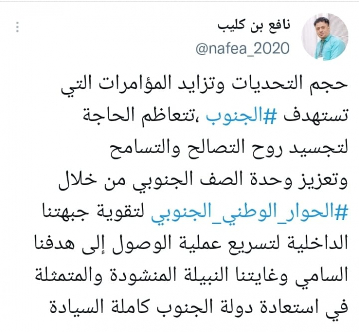 حذر الناشط السياسي نافع بن كليب، من المؤامرات على الجنوب العربي، مشيرا إلى أن الحوار الوطني الجنوبي برعاية المجلس الانتقالي الجنوبي يعزز متانة الجبهة الداخلية.