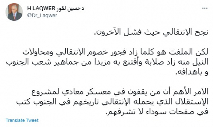 وقال في تغريدة عبر "تويتر" رصدها "المشهد العربي": "نجح الانتقالي حيث فشل الآخرون، لكن الملفت هو كلما زاد فجور خصوم الانتقالي ومحاولات النيل منه زاد صلابة واقتنع به مزيدا من جماهير شعب الجنوب وبأهدافه".