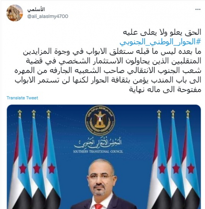 وكتب في تغريدة عبر "تويتر" رصدها "المشهد العربي": "الحق يعلو ولا يعلى عليه.. الحوار الوطني الجنوبي ما بعده ليس ما قبله ستغلق الأبواب في وجوه المزايدين المتقلبين الذين يحاولون الاستثمار الشخصي في قضية شعب الجنوب".