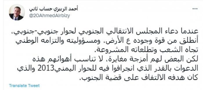 أشاد الناشط السياسي والإعلامي أحمد الربيزي، اليوم السبت، بدعوة المجلس الانتقالي الجنوبي لإجراء حوار جنوبي – جنوبي.