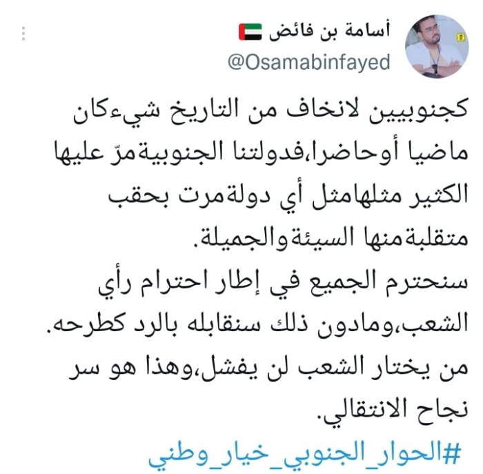 وأوضح في تغريدة على حسابه بموقع التدوين المصغر تويتر، اليوم أننا: "كجنوبيين لا نخاف من التاريخ شيء كان ماضيا أو حاضرا".
