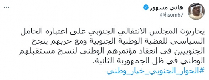 وأردف: "مع حربهم ينجح الجنوبيون في انعقاد مؤتمرهم الوطني لنسج مستقبلهم الوطني في ظل الجمهورية الثانية"، مضيفا هاشتاج: "الحوار الجنوبي خيار وطني".