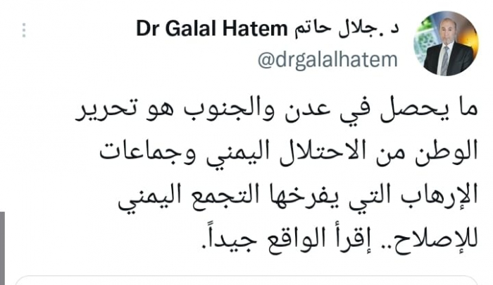 وقال في تغريدة على حسابه بموقع التدوين المصغر تويتر، اليوم إن: "ما يحصل في عدن والجنوب هو تحرير الوطن من الاحتلال اليمني وجماعات الإرهاب التي يفرخها التجمع اليمني للإصلاح، إقرأ الواقع جيداً".