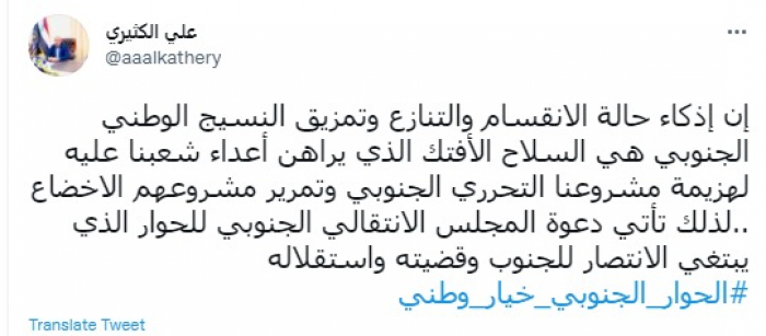 واختتم تغريدته بهاشتاج: "الحوار الجنوبي خيار وطني".
