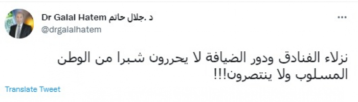 وقال في تغريدة عبر "تويتر" رصدها "المشهد العربي": "نزلاء الفنادق ودور الضيافة لا يحررون شبرًا من الوطن المسلوب ولا ينتصرون".