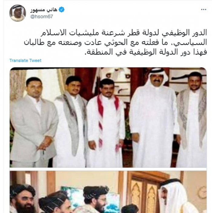 وقال في تغريدة عبر "تويتر" رصدها "المشهد العربي": "الدور الوظيفي لدولة قطر شرعنة مليشيات الإسلام السياسي، ما فعلته مع الحوثي عادت وصنعته مع طالبان فهذا دور الدولة الوظيفية في المنطقة".
