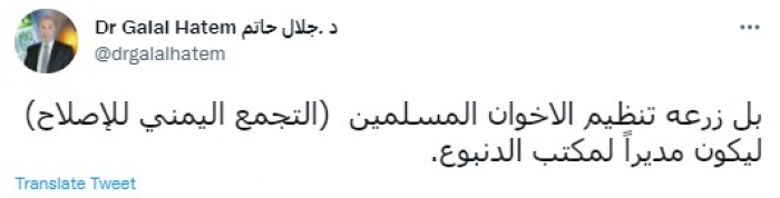 وكتب في تغريدة عبر "تويتر" رصدها "المشهد العربي": "بل زرعه تنظيم الإخوان المسلمين (التجمع اليمني للإصلاح) ليكون مدير لمكتب الدنبوع".
