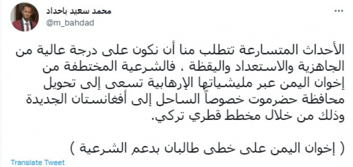 وكتب في تغريدة عبر "تويتر" رصدها "المشهد العربي": "الأحداث المتسارعة تتطلب منا أن نكون على درجة عالية من الجاهزية والاستعداد واليقظة، فالشرعية المختطفة من إخوان اليمن عبر مليشياتها الإرهابية تسعى إلى تحويل محافظة حضرموت خصوصًا الساحل إلى أفغانستان الجديدة وذلك من خلال مخطط قطري تركي".