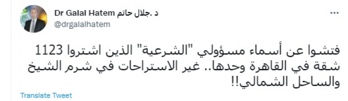 وقال في تغريدة عبر "تويتر" رصدها "المشهد العربي": "فتشوا عن أسماء مسؤولي الشرعية الذين اشتروا 1123 شقة في القاهرة وحدها.. غير الاستراحات في شرم الشيخ والساحل الشمالي".