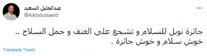 وقال في تغريدة عبر "تويتر" رصدها "المشهد العربي": " جائزة نوبل للسلام وتشجع على العنف وحمل السلاح.. خوش سلام و خوش جائزة".