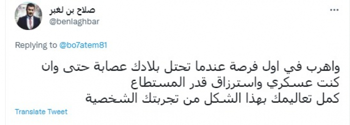 وقال في تغريدة عبر "تويتر" رصدها "المشهد العربي": "واهرب في أول فرصة عندما تحتل بلادك عصابة حتى وأن كنت عسكري واسترزاق قدر المستطاع".