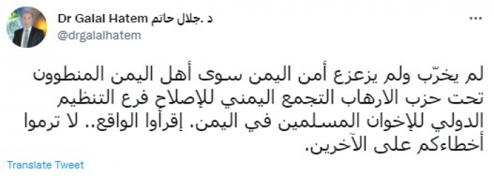 وكتب في تغريدة عبر "تويتر" رصدها "المشهد العربي": "لم يخرّب ولم يزعزع أمن اليمن سوى أهل اليمن المنطوون تحت حزب الإرهاب التجمع اليمني للإصلاح فرع التنظيم الدولي للإخوان المسلمين في اليمن. اقرأوا الواقع.. لا ترموا أخطاءكم على الآخرين".