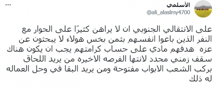 طالب الناشط السياسي علي الأسلمي، المجلس الانتقالي الجنوبي، بتحديد سقف زمني لقبول دعوة الانضمام إلى الحوار الجنوبي، وتجاهل الغارقين في العمالة للاحتلال اليمني.