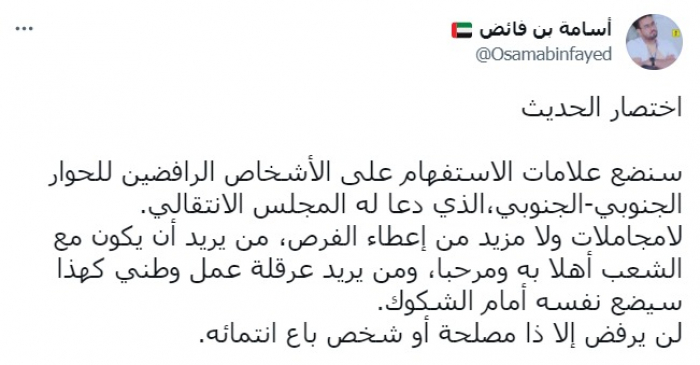 وقال في تغريدة على حسابه بتويتر، اليوم الخميس، إنه: "اختصار الحديث، سنضع علامات الاستفهام على الأشخاص الرافضين للحوار الجنوبي – الجنوبي الذي دعا له المجلس الانتقالي".