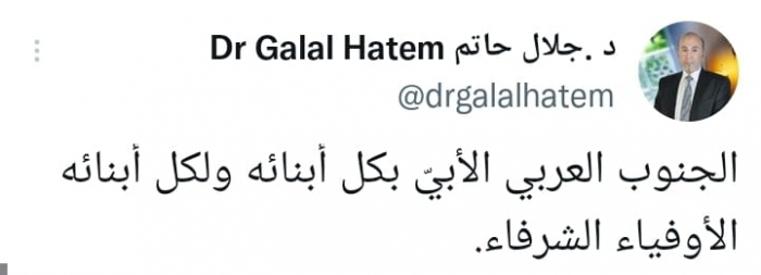 وقال في تغريدة على حسابه بموقع التدوين المصغر تويتر، اليوم إن: "الجنوب العربي الأبيّ بكل أبنائه ولكل أبنائه الأوفياء الشرفاء".